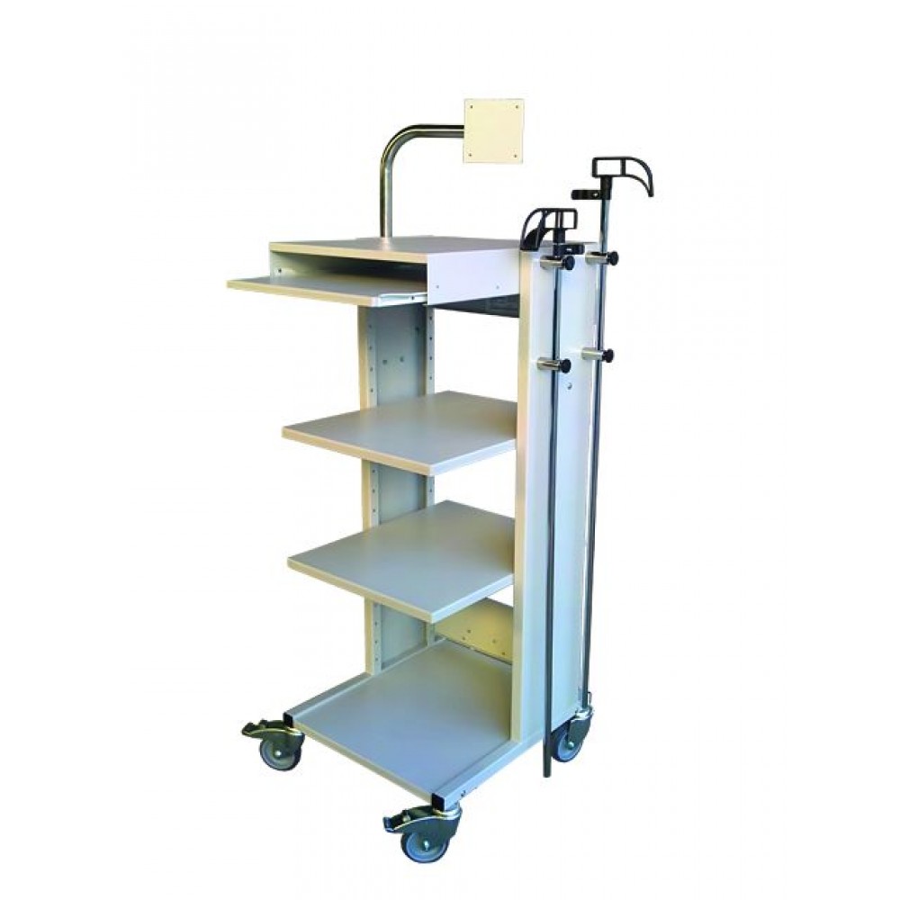 Troliu r4 - gabarit 49x55x120cm;cota activa unde intra aparatul - 43x55, corp metalic vopsit alb brobonat(gri), mobil, 4 roti pivotante(2 cu frana, ø 120); 5 polite metalice;suport tastatura; priza electrica atasata pe corpul rack-ului;suport rabatabil pentru monitor;2 suporti pentru tubulatura camera video