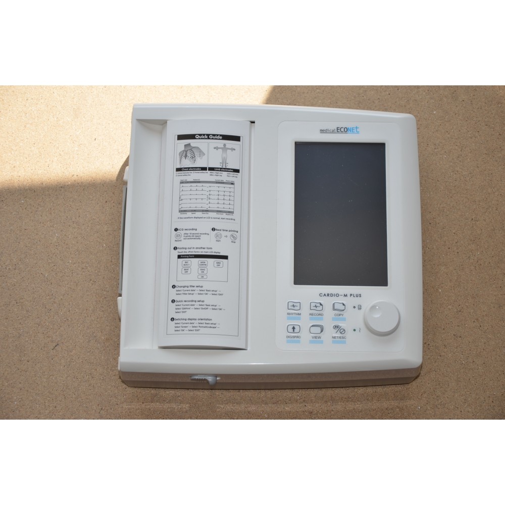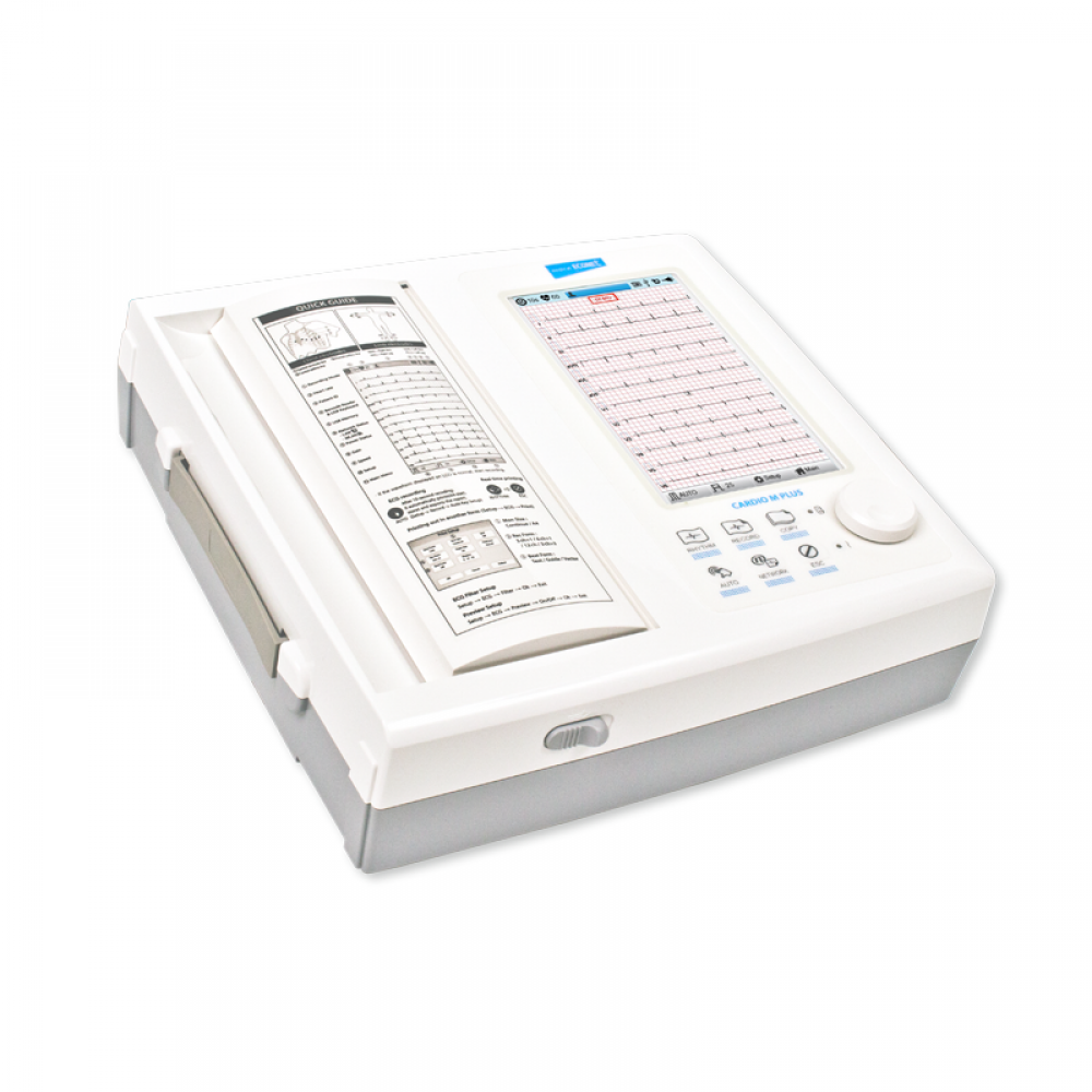 - Cardio M Plus este un electrocardiograf cu 12 canale şi ecran color touch-screen LCD 7” (800 x 480 pixeli) care furnizează parametrii şi diagnosticul pacientului şi îmbunătăţeşte diagrama prin tipărirea informaţiilor, atât pentru operator, cât şi pentru pacient.